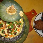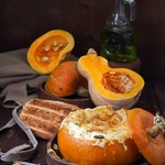 из мякоти тыквы и сливок сварила пюре, потом перелили в тыкву, добавила сыр, чеснок, для красоты помидор и потомила в духовке минут 30. Перед подачей посыпала зеленью и сухариками
