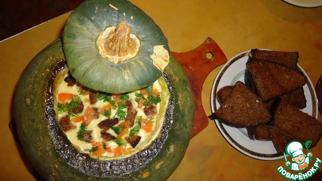 Тыкву наполнить слоями - хлеб, сыр. Залить все сливками.
