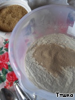 В миску просеять муку, смешать ее с сухими дрожжами, солью и коричневым сахаром.