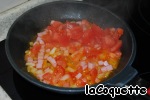...и помидор. Налейте чуть-чуть подсолнечного масла на сковороду, обжарьте сначала лук, затем добавьте к нему ветчину и помидор.