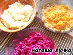 Подготовить продукты - картофель, морковь и свеклу отварить и почистить.