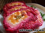Желатин смешать с майонезом, разделить на 3 части и добавить в картошку, морковку и свеклу. Если свекла сочная - то майонеза чуть меньше, а в картофель - больше.
