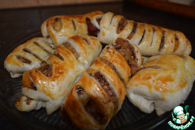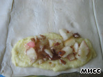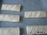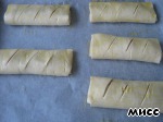 Сверните слойки рулетом так, чтобы "надрезы" оказались сверху. Уложите на противень, покрытый пергаментом.