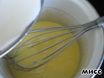Закипевшее молоко осторожно вливаем в желтки, сначала по каплям, потом струйкой, чтобы они сразу не свернулись.