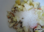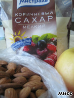 Яблоко мелко нарежьте, достаточно четвертинки на эту порцию. Добавьте дробленый миндаль и коричневый сахар.
