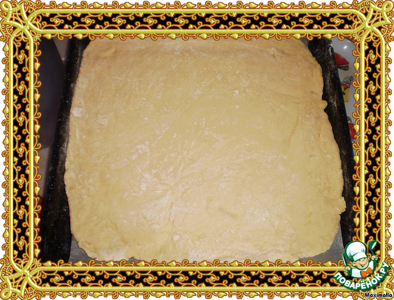 Далее нужно обмять тесто, которое подошло, и, разделив белую часть пополам, распределить ее на противне с пергаментом. У меня квадратный противень.