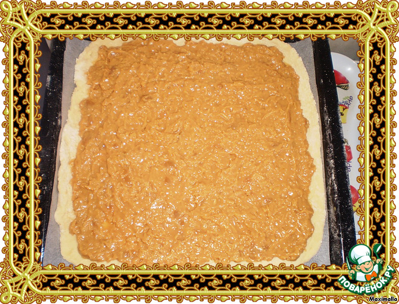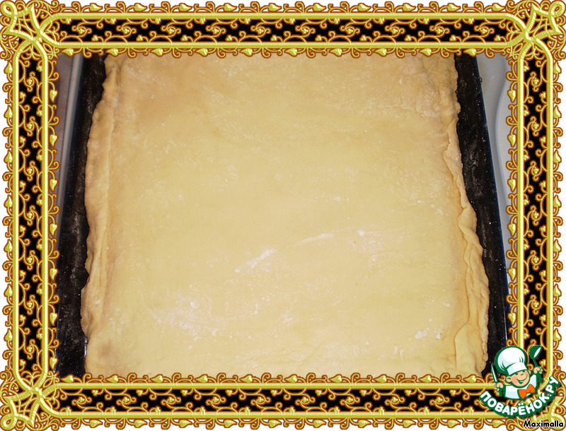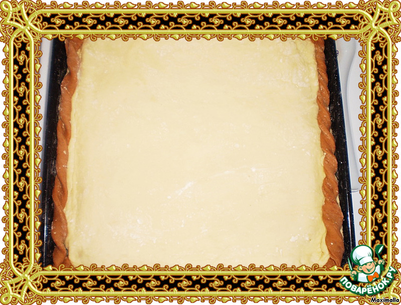 Накрыть второй половиной белого теста. Первую, нижнюю часть я не раскатывала, просто руками распределила, а вот с верхней без этого не обойтись))
