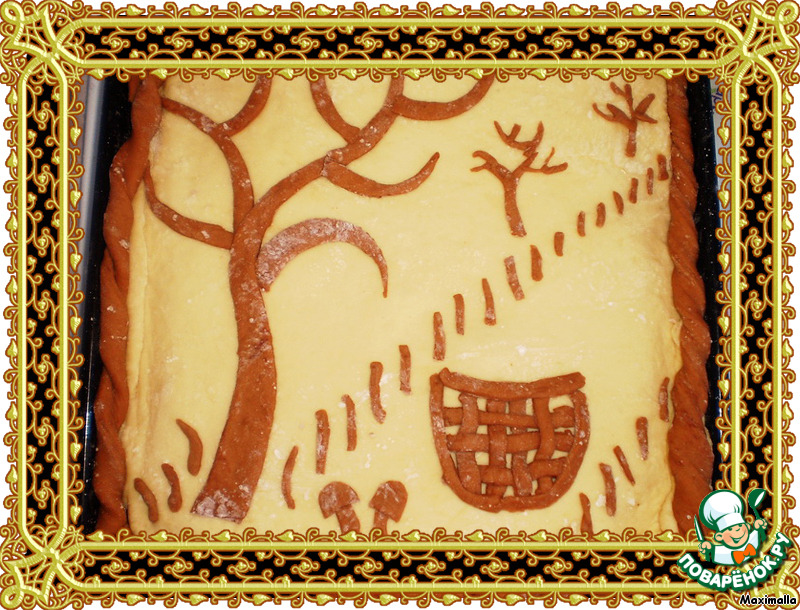 Дальше просто полет фантазии – фруктовый сад, деревья, грибочки, корзина с этими самыми «дарами осени», пусть для кого-то это будут орешки, для кого-то яблоки. Далее смазываем яйцом, перемешанным с молоком (буквально половинка чайной ложки).