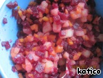 Очень мелкими кубиками нарезать серединки свеклы, морковь, картофель, посолить, заправить оливковым маслом, добавить замаринованный лук