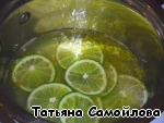 Один лайм нарезать кружочками, с двух натереть на терке цедру и выжать сок. Вскипятить в кастрюле 120 мл воды с тремя ложками коричневого сахара и лаймовым соком, добавить в сироп цедру и кружочки лайма.