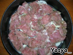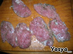 Нарезаем мясо кусочками примерно 1 см толщиной и расплющиваем его до вида "блинчика", солим, приправляем и заливаем разведенным уксусом.