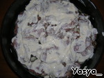 Сверху выкладываем картофель, посыпаем натертым сыром и смазываем сметаной (оставшейся). Ставим в духовку, разогретую до 180-200 градусов, на 40-50 мин.