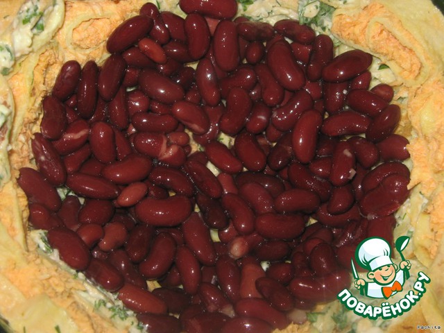 На сайте есть уже рецепт салата с таким названием. Предлагаю свой вариант с другими ингредиентами и оформлением.