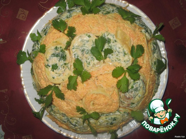 Перед подачей плёнку разворачиваем, форму переворачиваем на большую тарелку, снимаем плёнку и украшаем листочками зелени.
