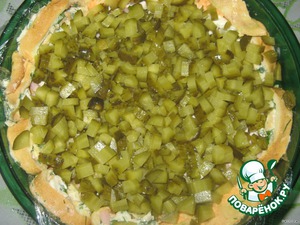 Огурцы, майонез. Заворачиваем концы плёнки и даём салату настояться 2-3 часа.