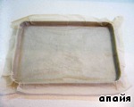 Я пекла пирог по всем правилам, и для этого взяла противень прямоугольной формы (25 х 30). И застелила противень бумагой для выпечки, чтобы мое тесто не пригорело.
