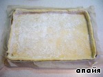 Достала тесто из холодильника, раскатала его, подсыпая мукой на столе. Тесто должно быть высотой 1 см. Уложила его в противень. Протыкала тесто при помощи вилки и выпекала около 30 минут в заранее разогретой духовке.