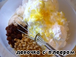На желтковую массу выложить взбитый белок, осторожно сверху насыпать муку, смешанную с разрыхлителем, добавить цедру, орешки и изюм. Аккуратно перемешать снизу вверх.