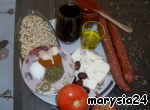 Теперь приступаем к сервировке. Режем колбаски кружочками, фету - квадратиками. Выкладываем фасоль в тарелку, сверху добавляем фету и колбаску.