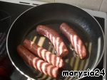 Пока варится фасоль, обжариваем колбаски до золотистого цвета.