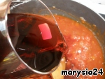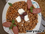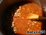 Полуготовую фасоль снимаем с огня и сливаем с нее воду. Добавляем в фасоль соус, оливковое масло и 1 ст. воды и ставим на медленный огонь на минут 20.