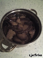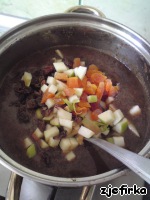 После этого ставим на огонь кастрюлю с хлебной массой, доводим до кипения. Добавляем туда подготовленные фрукты. Варим на небольшом огне 15-20 минут, помешивая периодически. В конце варки всыпаем лимонную кислоту.