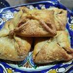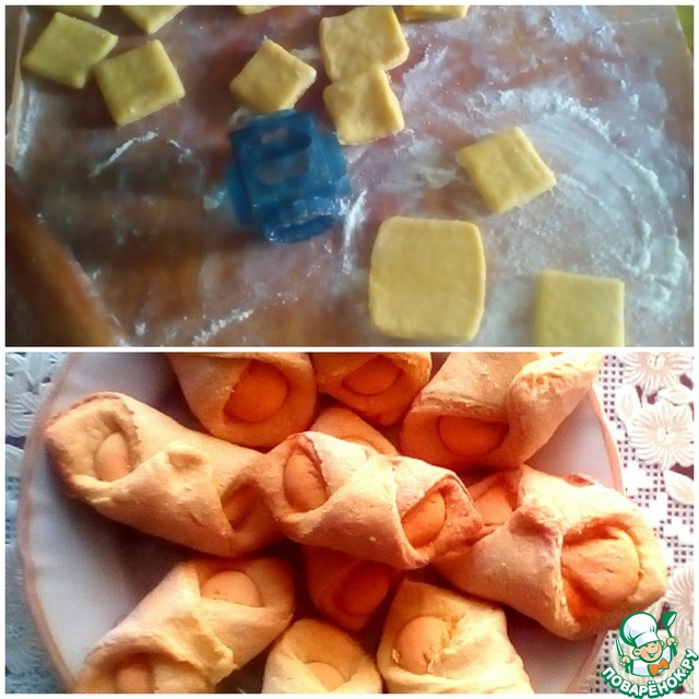 Раскатать тесто толщиной 3-4 мм. Порезать кубиками-ромбиками, на середину выложить начинку.