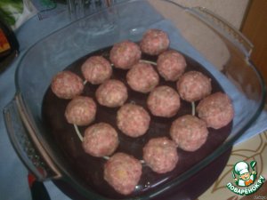 Достаем наши мясные шарики и выкладываем на них лук, подливаем немного воды и еще минут на 15 на среднем огне в духовке (время, конечно, зависит от размера шариков).