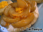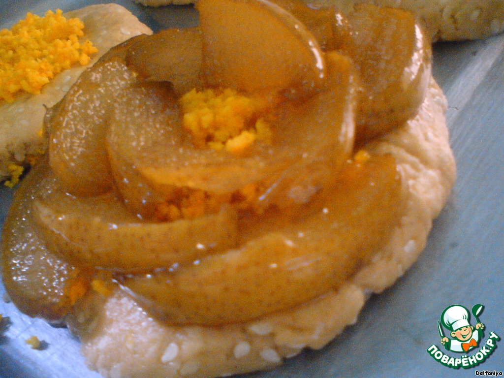 Когда сироп в грушах уварится, выложим готовые дольки в виде цветка. Одной груши мне хватило на два коржика.