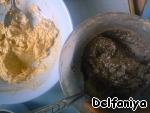 Разделим получившееся на две части и вмешаем в каждую, соответственно, черный и белый кунжут. Я предварительно помолола черный кунжут, чтобы тесто получилось однородным по цвету и более темным, для контраста со светлыми коржиками. Это делать не обязательно. Теперь в каждое тесто добавим по 150 г муки, смешанной с содой.