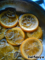 Приготовим цитрусы в карамели. Количество долек – по количеству оставшихся коржиков (не украшенных грушами). Так же с небольшим количеством воды и 50 г сахара уварить до густого сиропа.