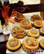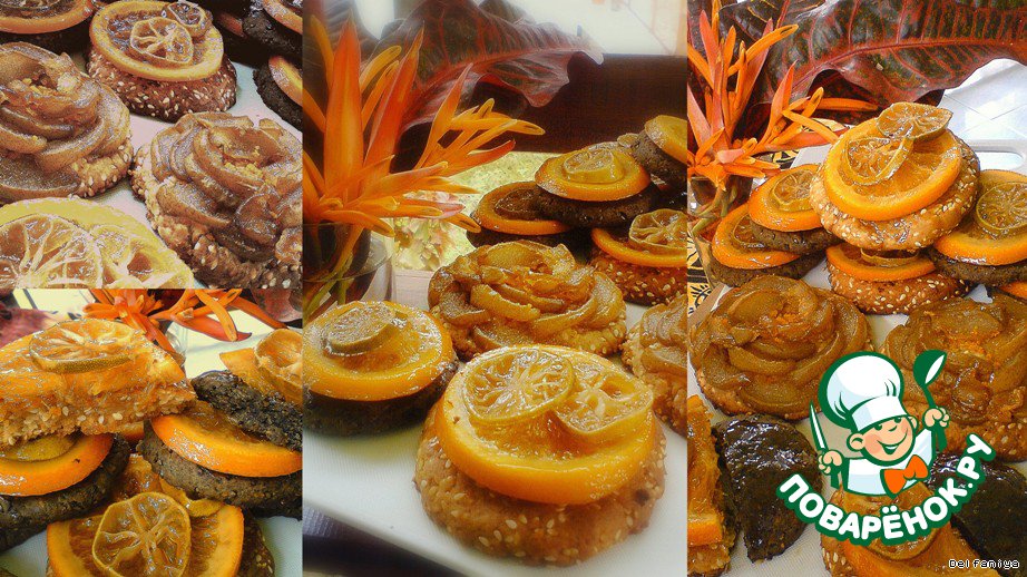 Эти коржики очень вкусны сами по себе. Воздушные и легкие, но в тоже время хрустящие. Я часто готовлю кунжутную выпечку, потому что выбор орехов у нас невелик, семечки тоже все привозные. Эти коржики тоже пекла не раз. А потом захотелось чего-то похожего, но при этом более сочного и праздничного, как пирожные, и я их «нарядила» фруктами. Получилось совершенно новое блюдо – очень интересное сочетание кунжута с карамельной грушей. А сироп, в котором варятся цитрусы, после остывания превращается в ароматное желе!
