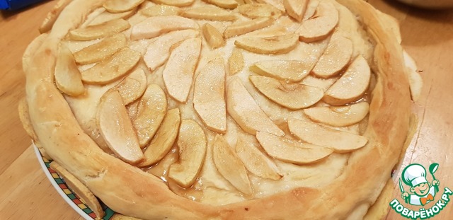 Ломтики яблок уложить "чешуёй" по поверхности. Украсить остатком теста.