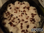 Когда все тесто выпечено, приступаем с сборке торта. Большую тарелку (я брала форму диаметром 24) застилаем пищевой пленкой или мешком полиэтиленовым, наливаем крема чуть-чуть и выкладываем на крем кружочки, снова поливаем кремом и посыпаем орехами и изюмом. Снова чуть-чуть поливаем кремом и уже только потом выкладываем кружочки. Весь этот процесс повторять, пока не закончатся кружочки