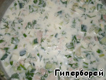 Добавляем к подготовленной окрошке и тщательно все перемешиваем. -