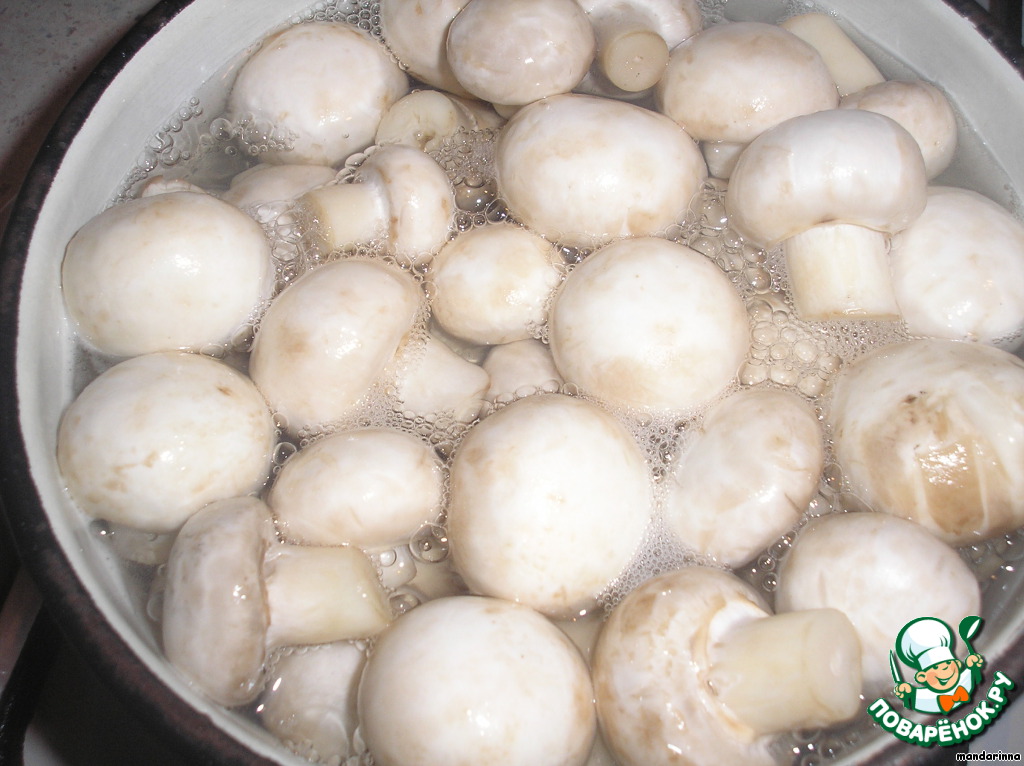 В кипящий маринад добавить проваренные грибы, довести до кипения и выключить.