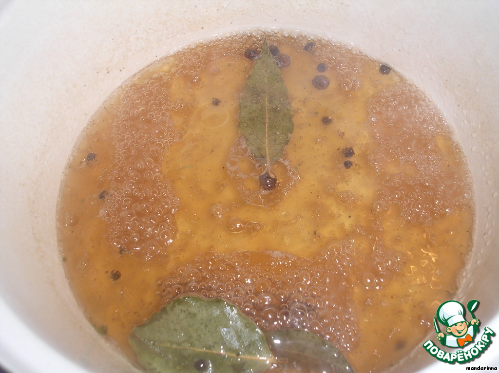 Приготовить маринад: в кастрюлю налить воду, уксус, растительное масло, всыпать соль, сахар, бульонный кубик "Галина Бланка", добавить лавровый лист, перец горошком. Довести до кипения.