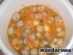 В горячую смесь добавить морковь, натертую на насадке для моркови по-корейски и чеснок, пропущенный через пресс.