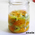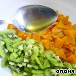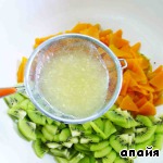 В удобную емкость я положила тыкву и киви. Добавила лимонный сок, процедив его.