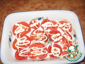 В огнеупорную посуду выкладываем слои: помидоры-соль-майонез