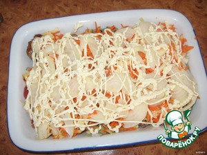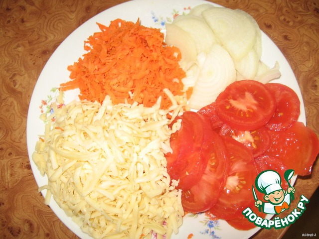 Лук нарезаем полукольцами, морковь и сыр трем на крупную терку, помидоры обдать кипятком, снять кожицу, порезать ломтиками.