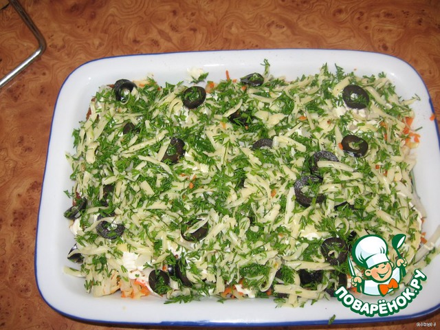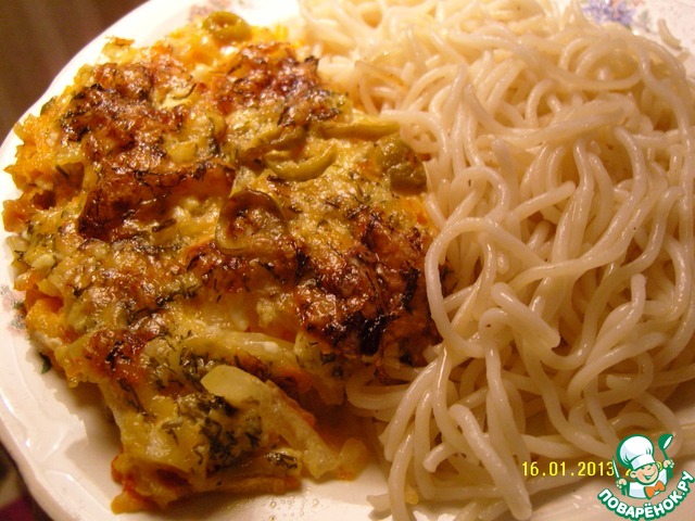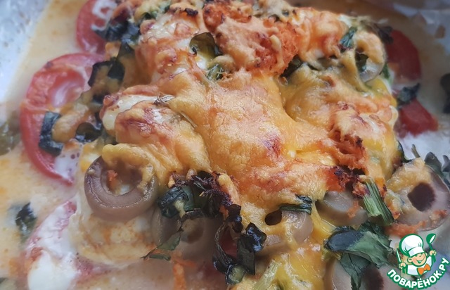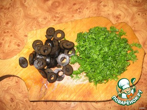 Сверху половина сыра смешанная с зеленью, маслинками. В разогретую духовку 180С на 20-30 мин. Приятного аппетита!!! Вкусно, красивая цветовая гамма, телятина получаеться очень сочной и нежной!