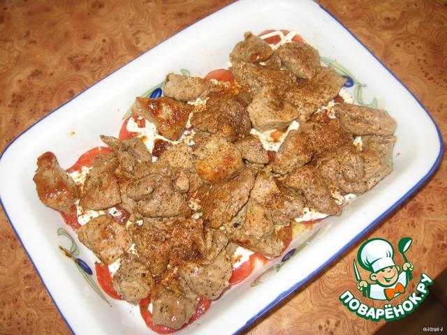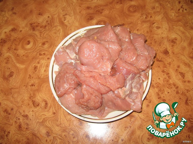 Телятину очищаем от пленок, режем на небольшие кусочки 3-4 см, слегка отбиваем, солим, перчим, добавляем приправы к мясу.