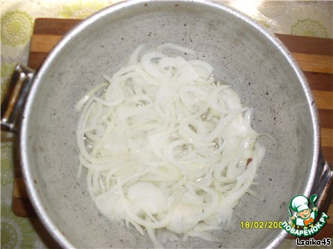 В казанок налила растительное масло и уложила слой лука, нарезанного полукольцами...