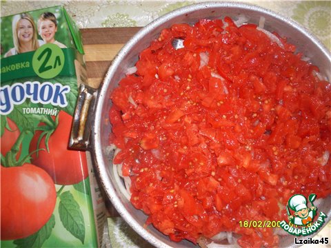 На рыбку - помидоры, нарезанные кубиками. Всё это дело залила томатным соком (правда, добавила немного воды, так как сок был довольно густой). Посолила, поперчила, посахарила и поставила тушиться на медленный огонь... Тушила 3,5 часа...