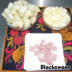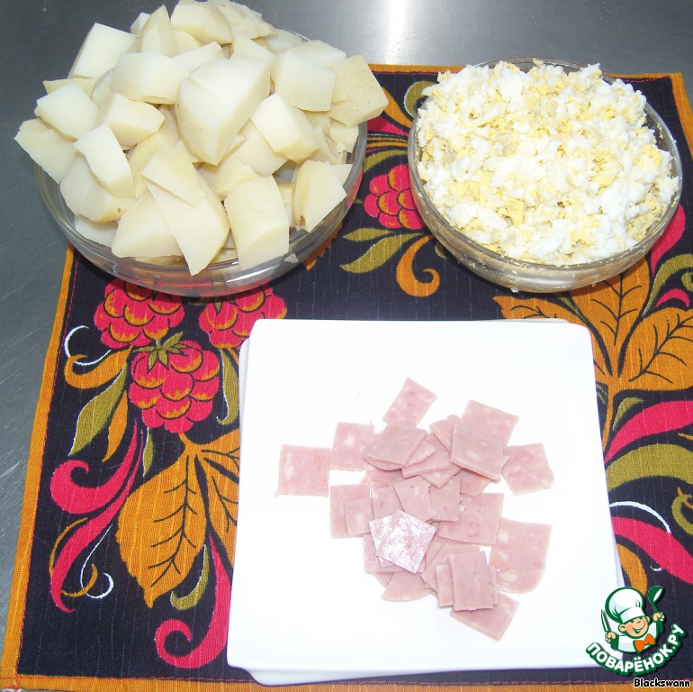 Кусочек колбаски режем на кусочки произвольной формы - у меня квадратики. Если в хозяйстве колбаска отсутствует, можно запросто обойтись и без неe :-) . -