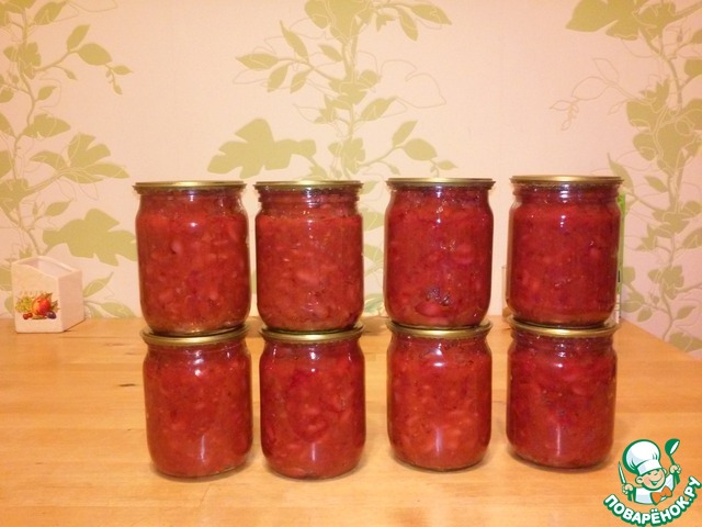 Подготовленные таким образом овощи складываем в кастрюлю, добавляем туда соль, сахар, растительное масло, томатный соус. Доводим до кипения и тушим 1. 5 часа. Перед раскладкой в банки добавляем уксусную эссенцию 0. 5 ст. л (можно заменить яблочным уксусом - 2 ст. л.). Разложить по банкам и закатать.