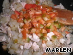 Перец нарезать мелко кубиками и добавить к овощам с курицей. Всё посолить, перемешать и переложить на смазанный маслом противень.