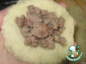 Из массы делаем лепешку, на нее кладем фарш, сверху другую лепешку.