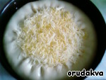Края теста загибаем и собираем в мешочек. Сверху посыпаем тёртым сыром.